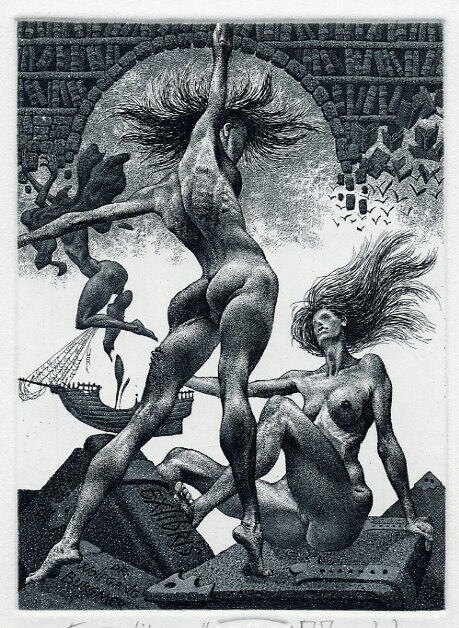 Para Ilustrar el artículo una idea encontró anclaje rápido en cuanto recordé a ese estupendo e impactante artista búlgaro especializado en ex-libris Julian Jordanov, hay en él cierto toque griego clásico, temas ingeniosos reinterpretados, figuras y siluetas que mezclaban fantasía y lujuria, y entre sus dibujos descollaban los dedicados a Heracles y otros iconos mitológicos de la Hélade, hasta podía verlo iluminando una obra sobre catapultas, en seguida seleccioné un grupo de láminas y las comparto animando el texto, sfyufa y salud